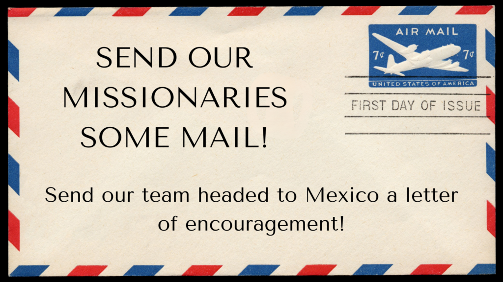 Our Mexico Missions Team is heading out soon to serve and share the love of Jesus! Let’s surround them with encouragement and prayer as they prepare to go. We invite you to write a letter or note of encouragement for our team — something simple to remind them that their church family is cheering them on. You can find a list of people going on Sunday in the Worship Center and drop your letters off by Sunday, November 2. Let’s send them off with love, support, and lots of encouragement as they go make a difference in Mexico!
