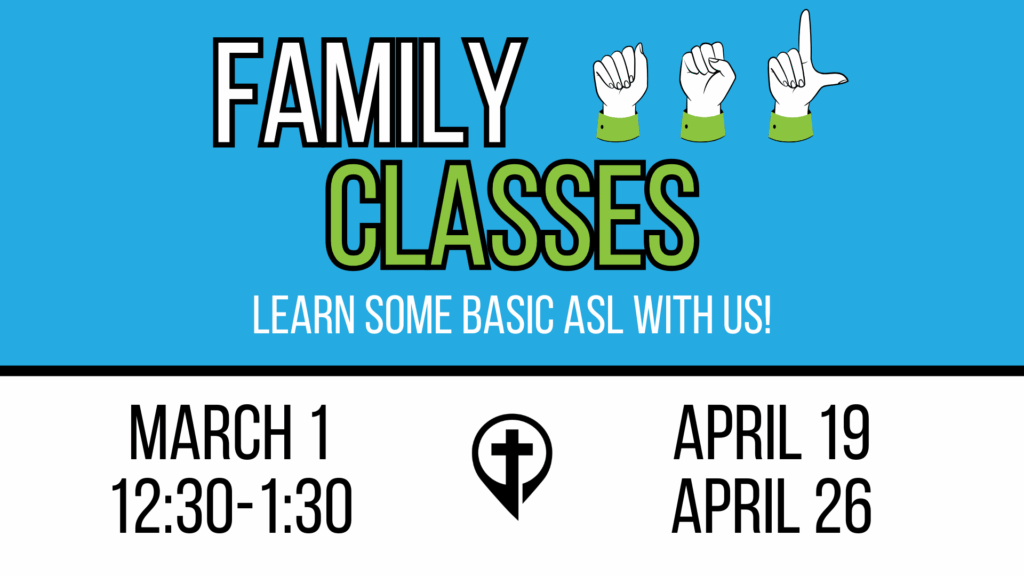 Come learn American Sign Language with us Sunday March 1 from 1230-130pm—this is the first of many classes! A fun, family-friendly way to learn and grow together. We’d love to have you join us. Light refreshments provided.